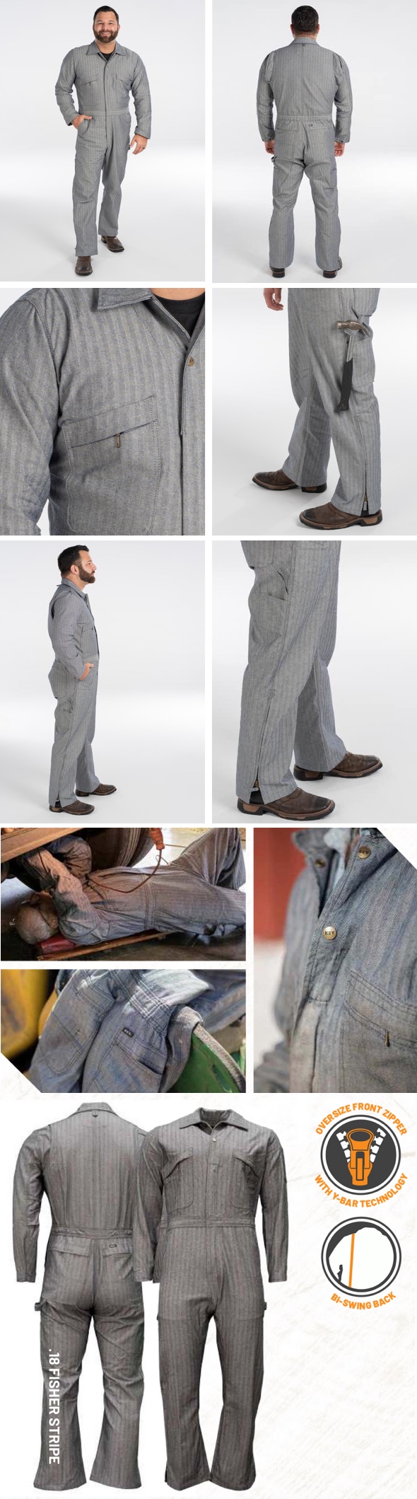 Fisher Stripe material adds that extra style you love so much too. The fabric has a Stain-Repellent Finish, as well. The back of these men's coveralls have a True Bi-Swing and an Elastic Waist take-up because being able to move freely is something every hard working person needs.